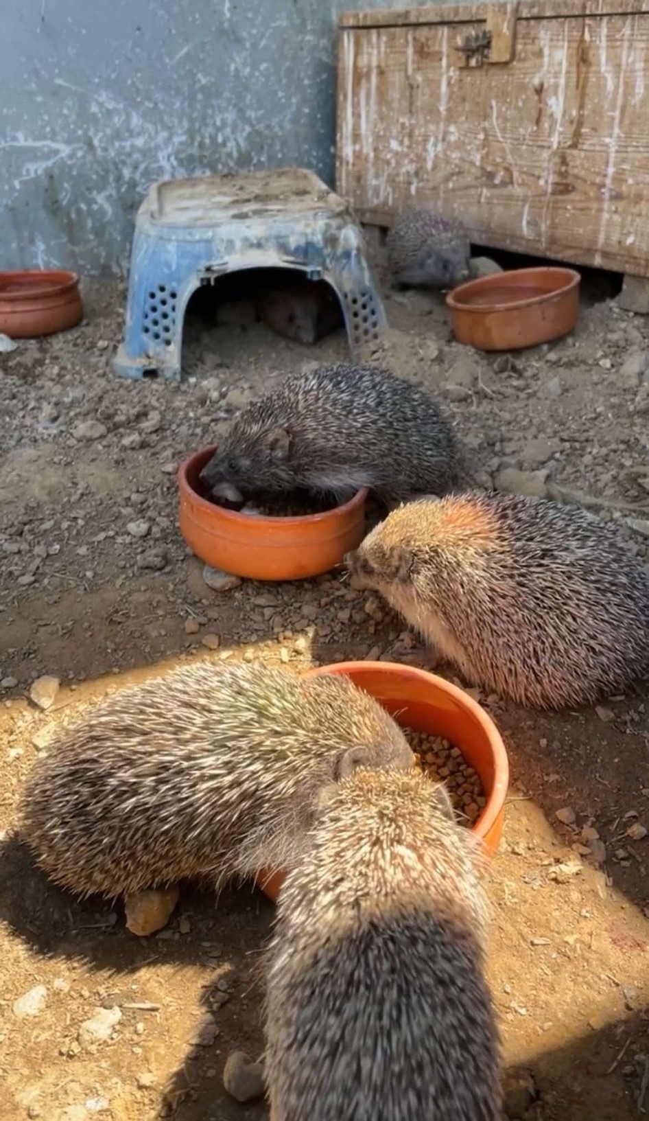 - Pause déjeuner pour les 15 hérissons de l’outside, qu’on vient nourrir avec des croquettes et des morceaux de poulet
