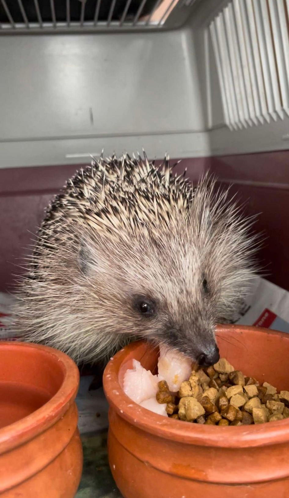 - Petit hérisson dans la warm room qui prend des forces pour rejoindre ses copains à l’extérieur avant la remise en liberté